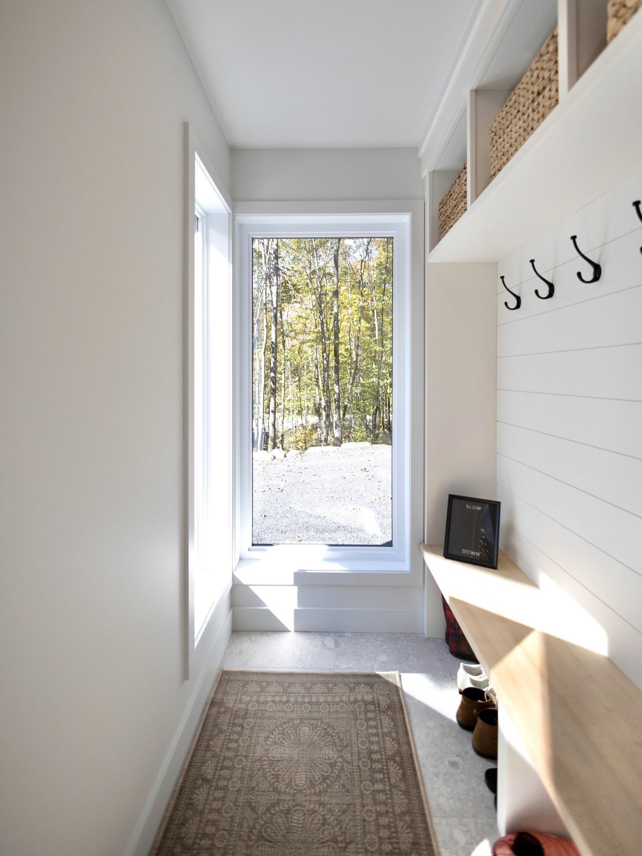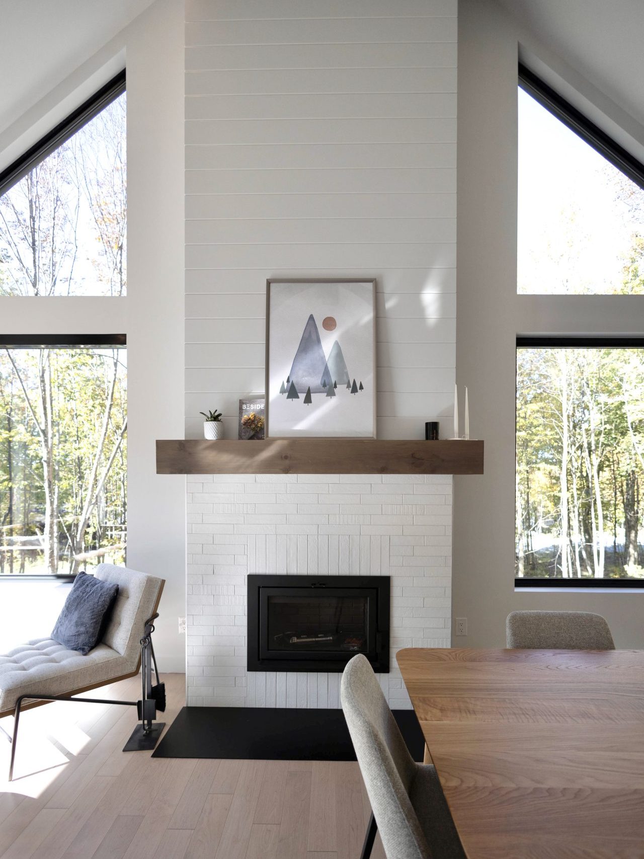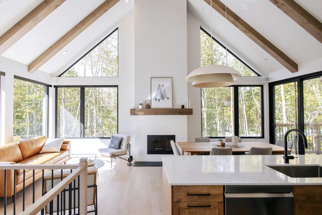 This Scandinavian-inspired house offers friendly spaces, ideal for gatherings with friends. The open living area is made up of a living room, a dining room, and a kitchen. This plan distinguishes itself by its large windows, as well as by its magnificent fireplace mantle which gives the space a remarkable presence. The cathedral ceiling, enhanced with wooden beams, unfolds over the living area, thus majestically highlighting the architecture of the residence.