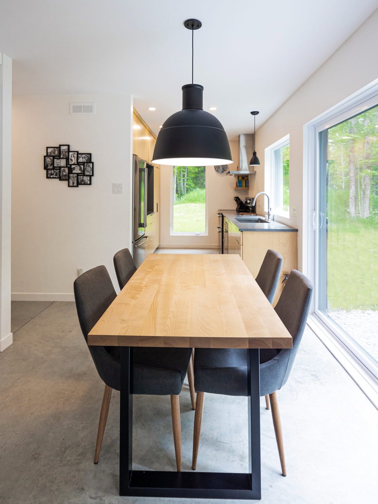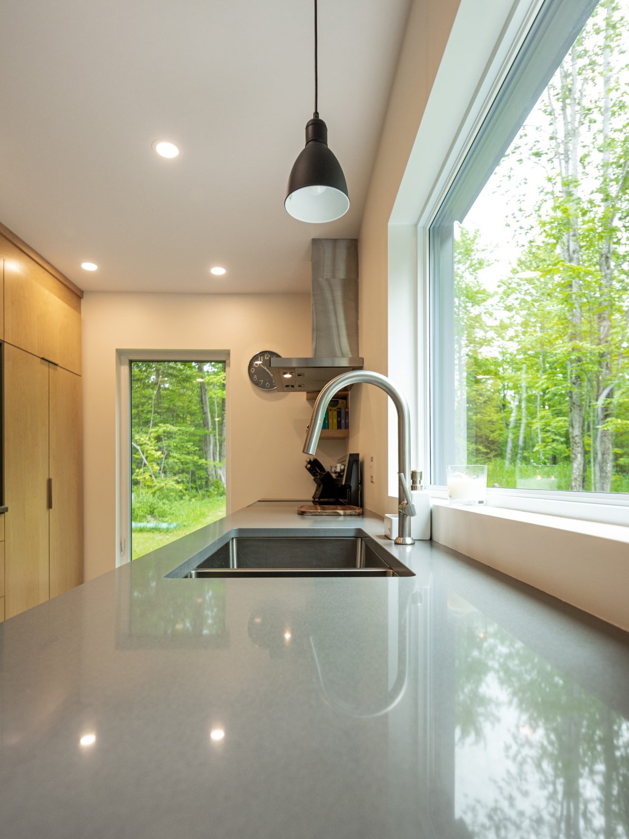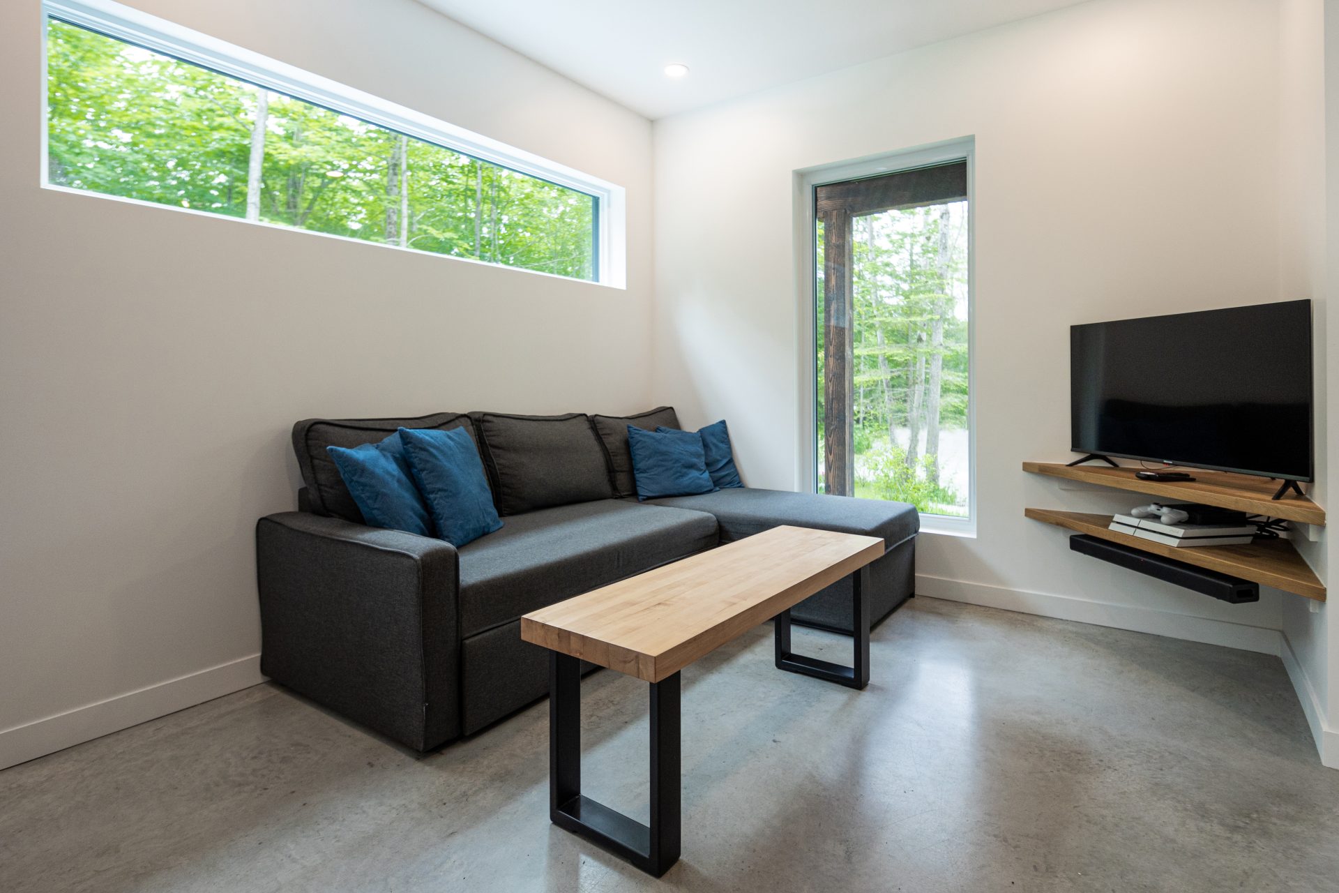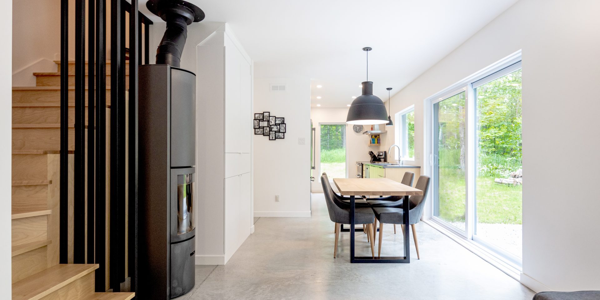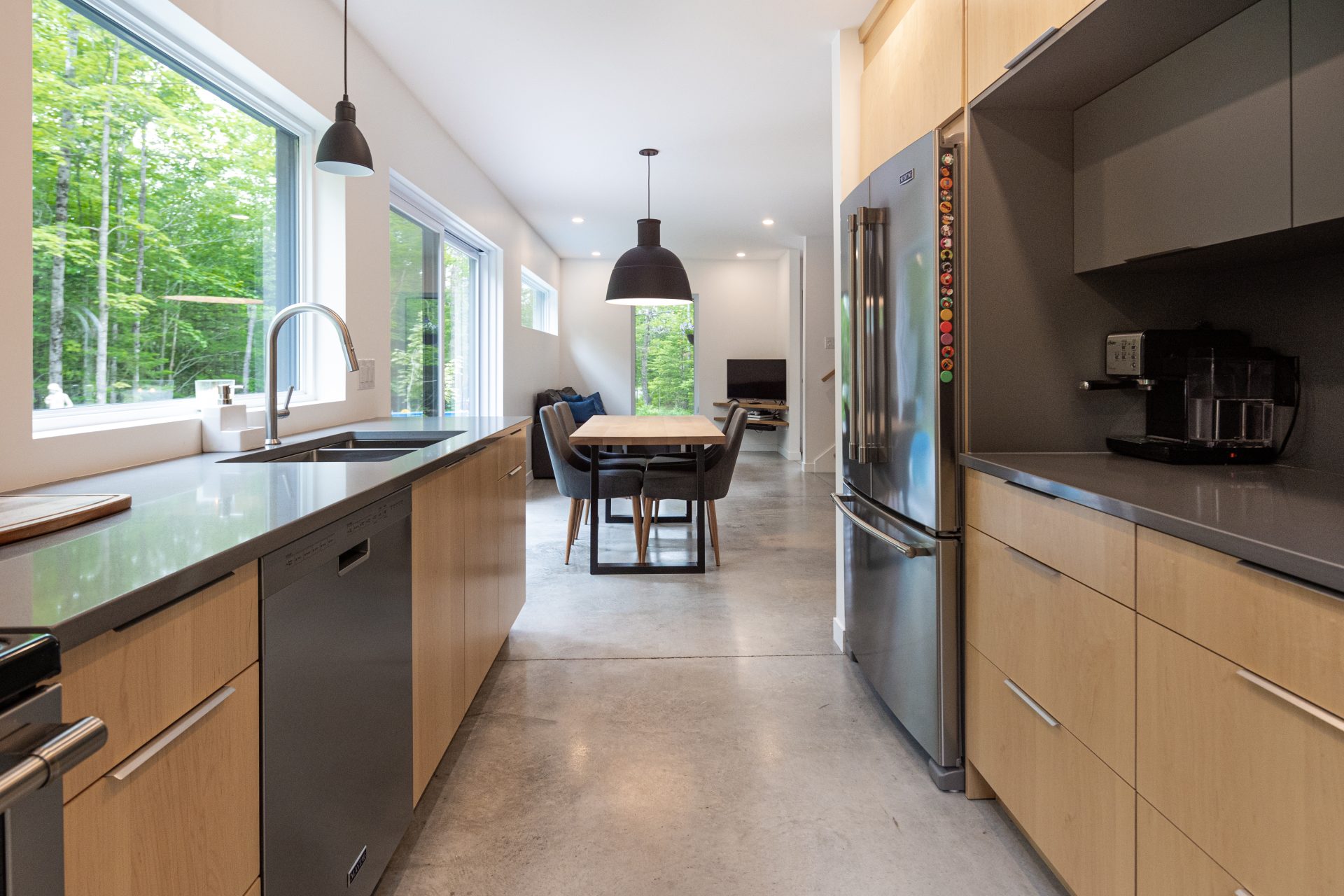Des espaces de vie à aire ouverte, deux chambres, dont l’une de type dortoir pour les enfants et une salle de bain complète concentrent toutes les activités au cœur de la maison!