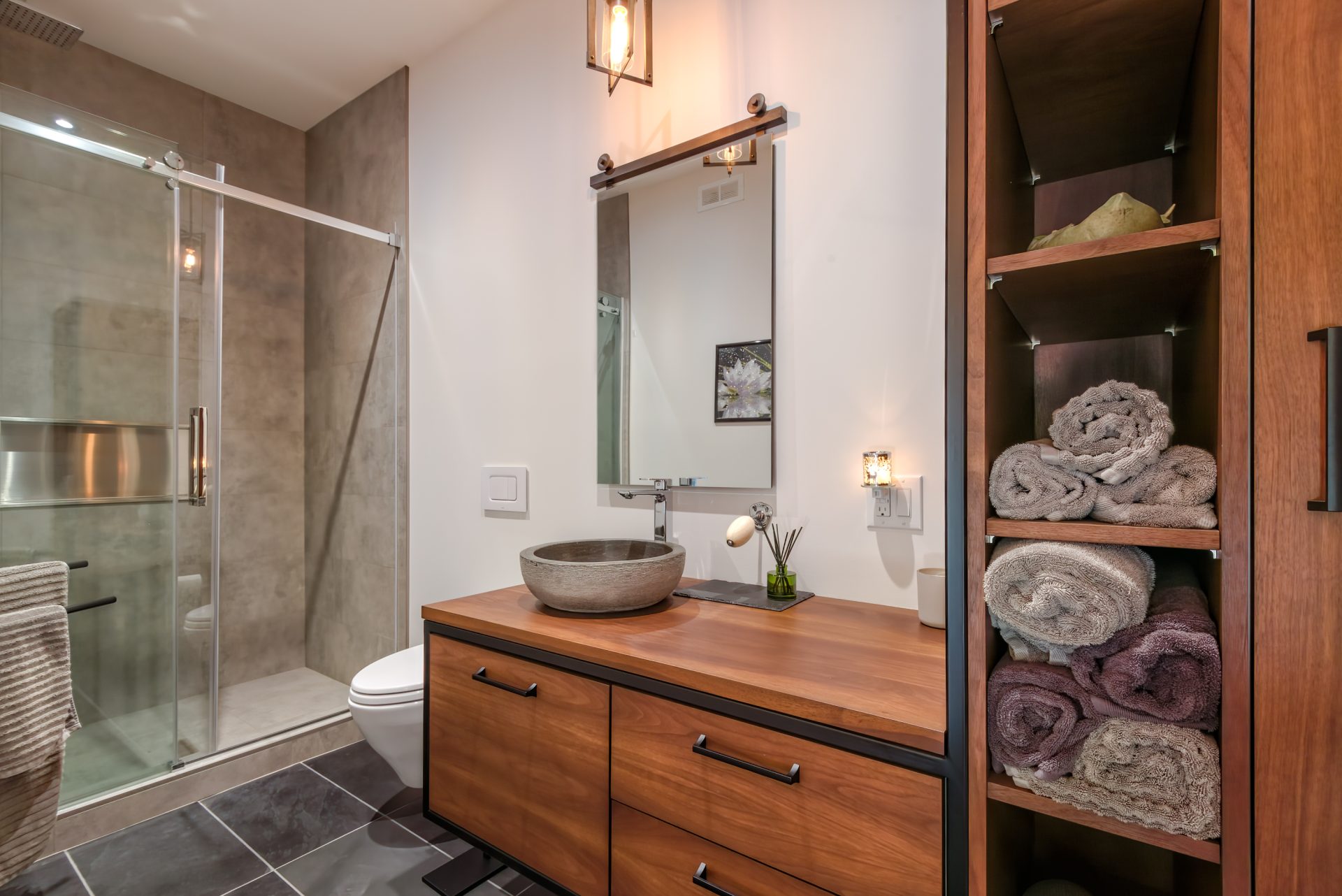 Pour profiter des belles saisons et accueillir les convives, une terrasse extérieure munie d’un foyer et d’une véranda avec moustiquaires complètent le tout. Il est également important de faire mention de l’impressionnant garage double de 580 pieds carrés qui était l’un des éléments coup de cœur de notre client!