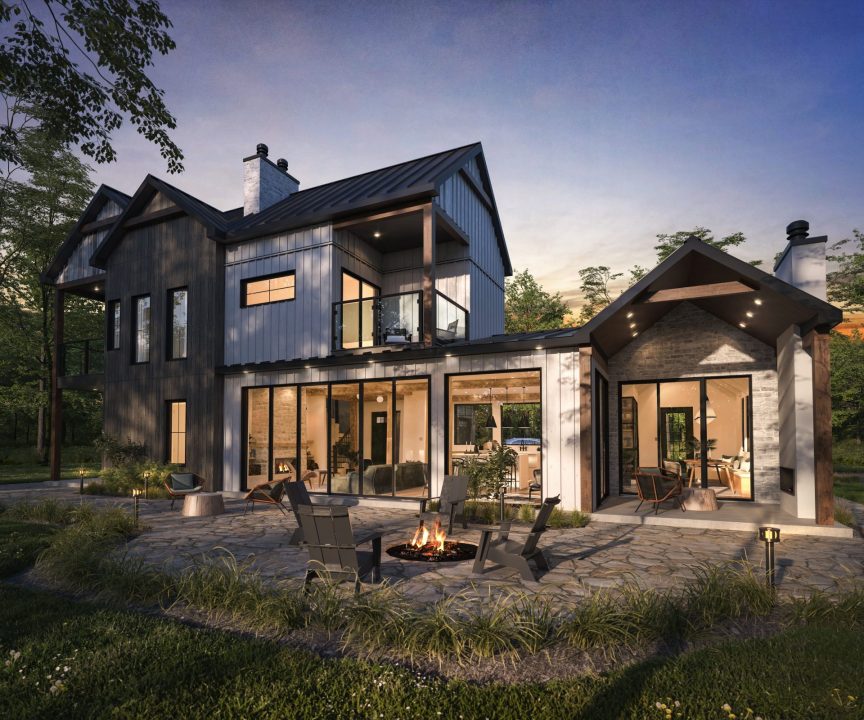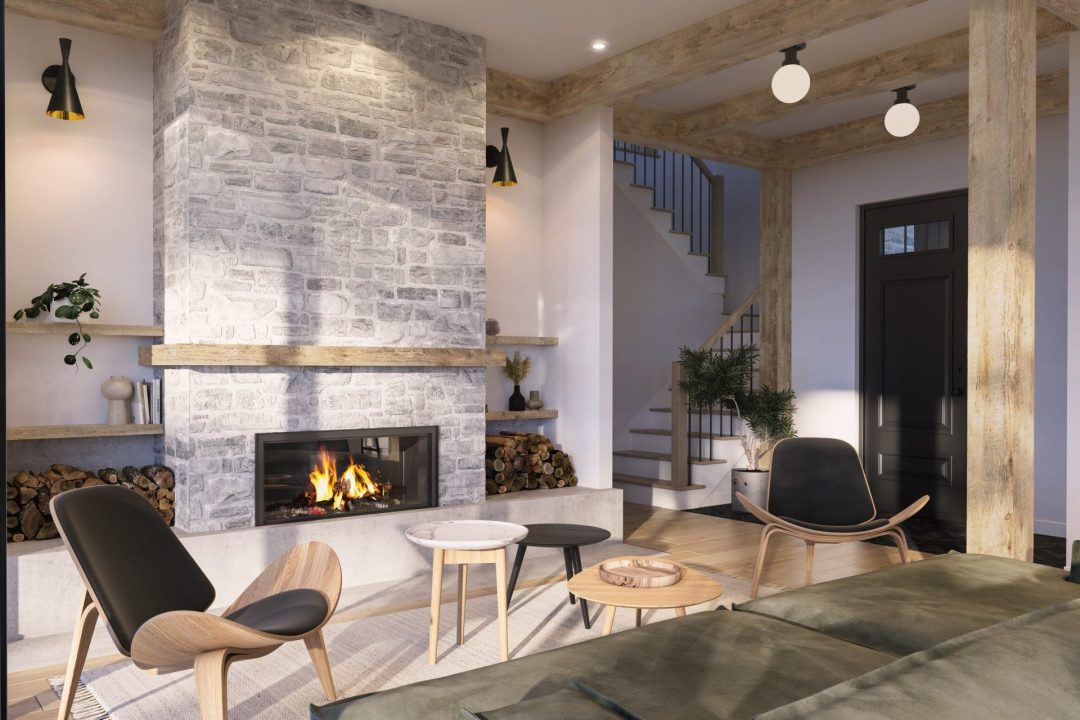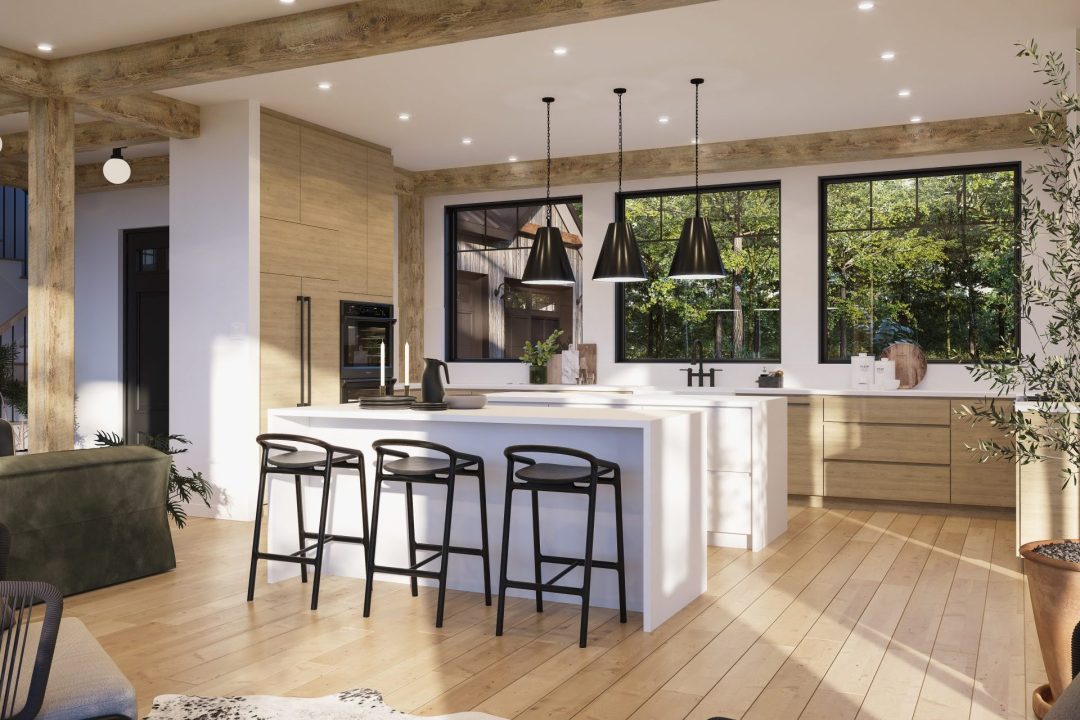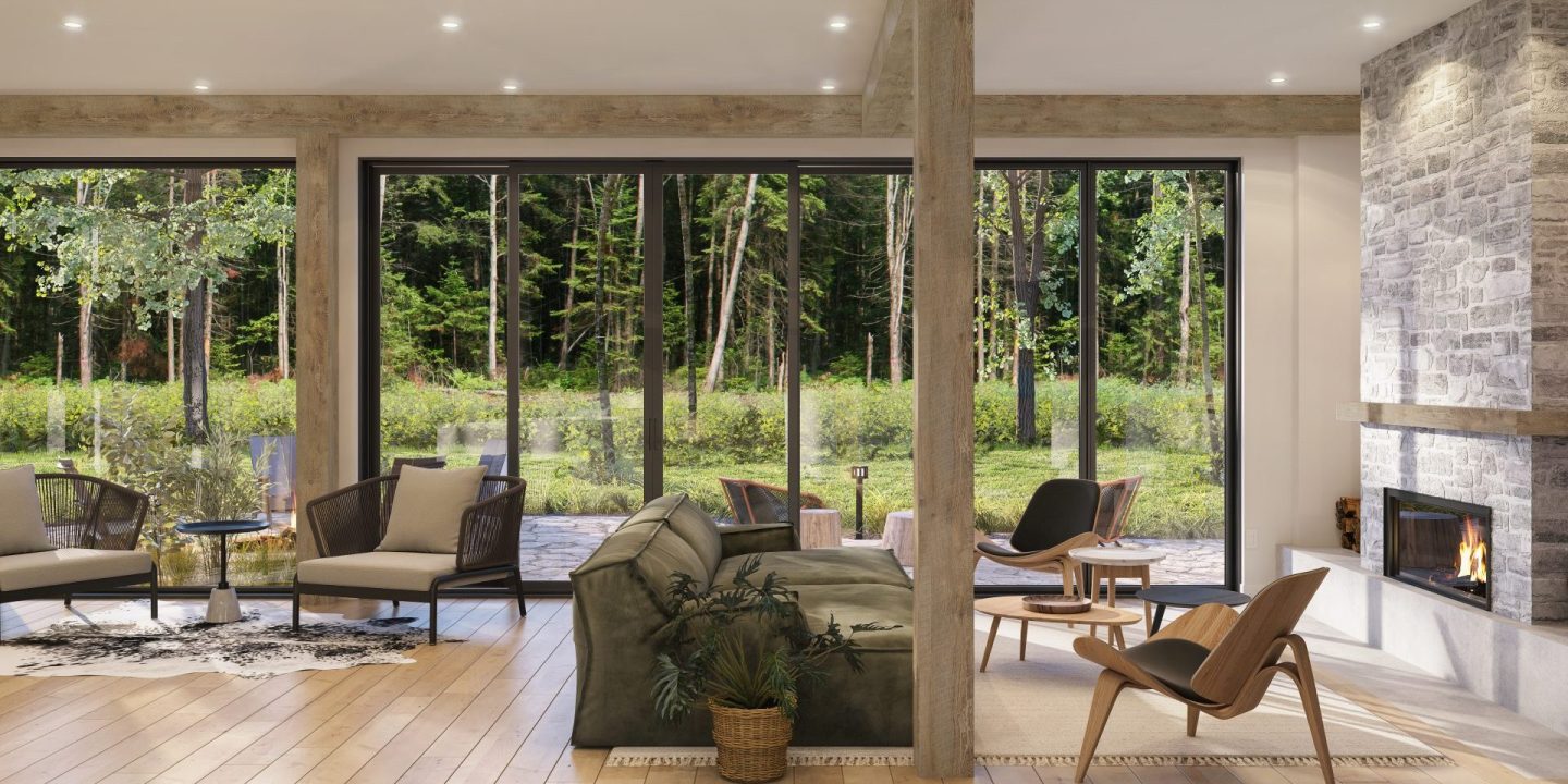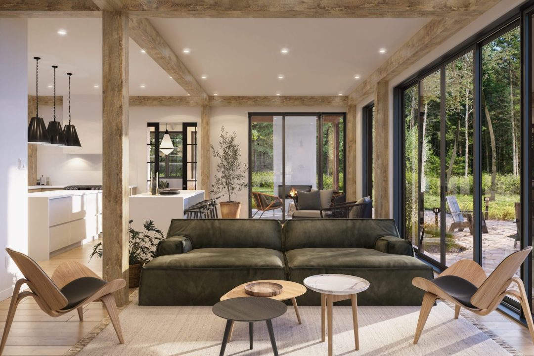 - Aire de vie avec charpente de bois massif
